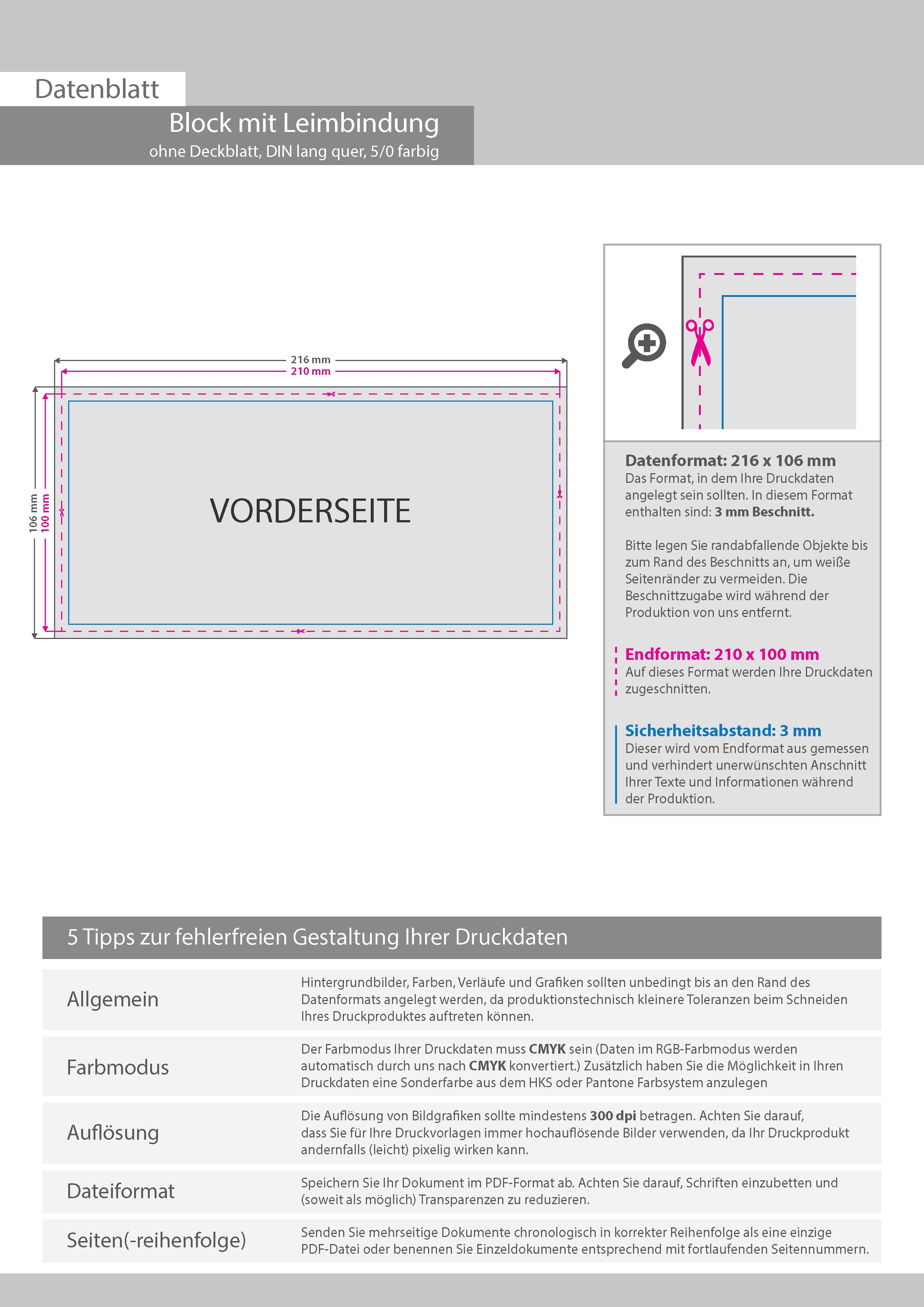 Block mit Leimbindung, DIN lang quer, 100 Blatt, 5/0 farbig einseitig bedruckt (CMYK 4-farbig + 1 Sonderfarbe HKS oder Pantone)