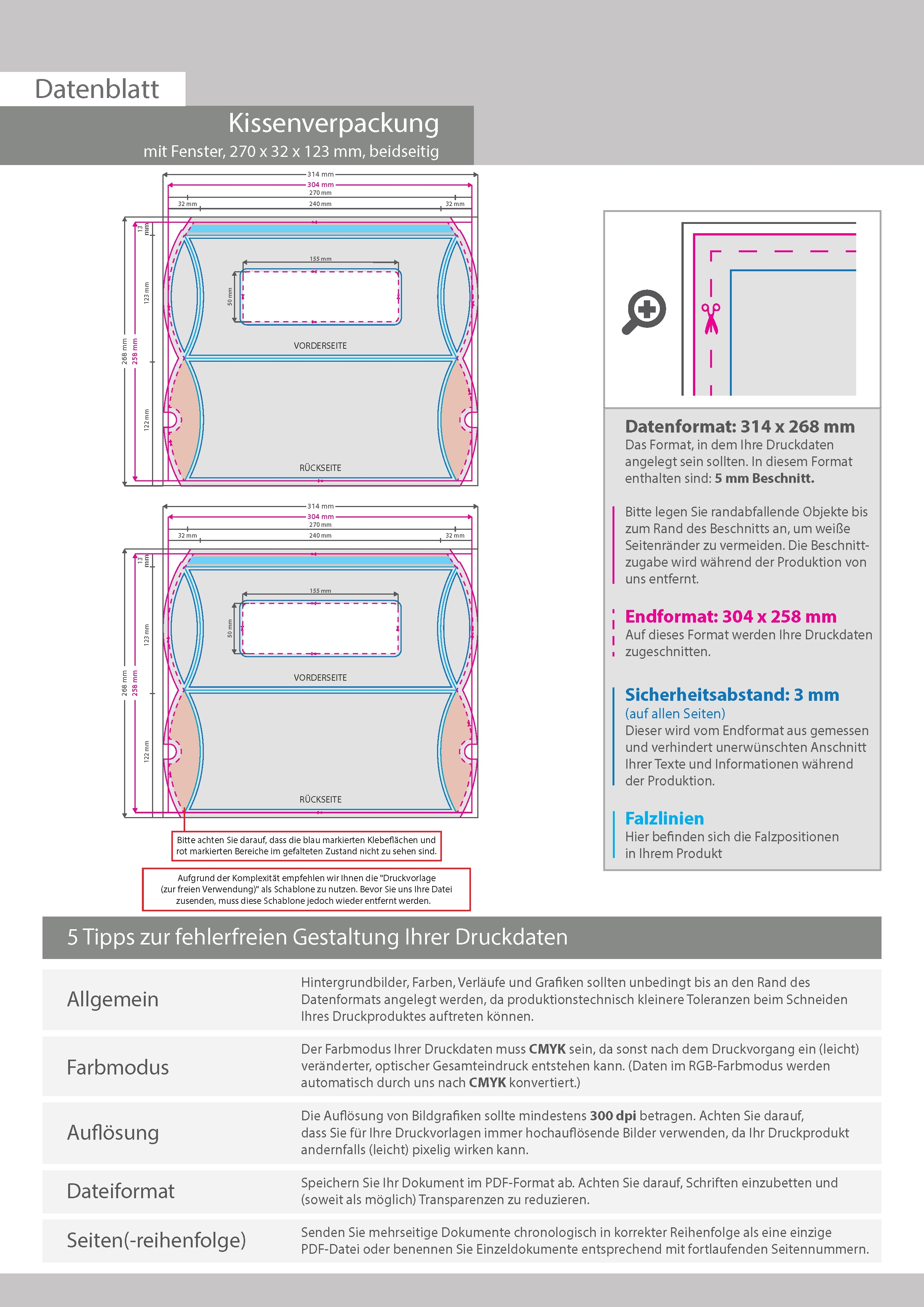 Kissenverpackung (27 cm x 3,2 cm x 12,3 cm) beidseitig bedruckt 5/4-farbig (CMYK + Sonderfarbe) mit geklebtem Fenster