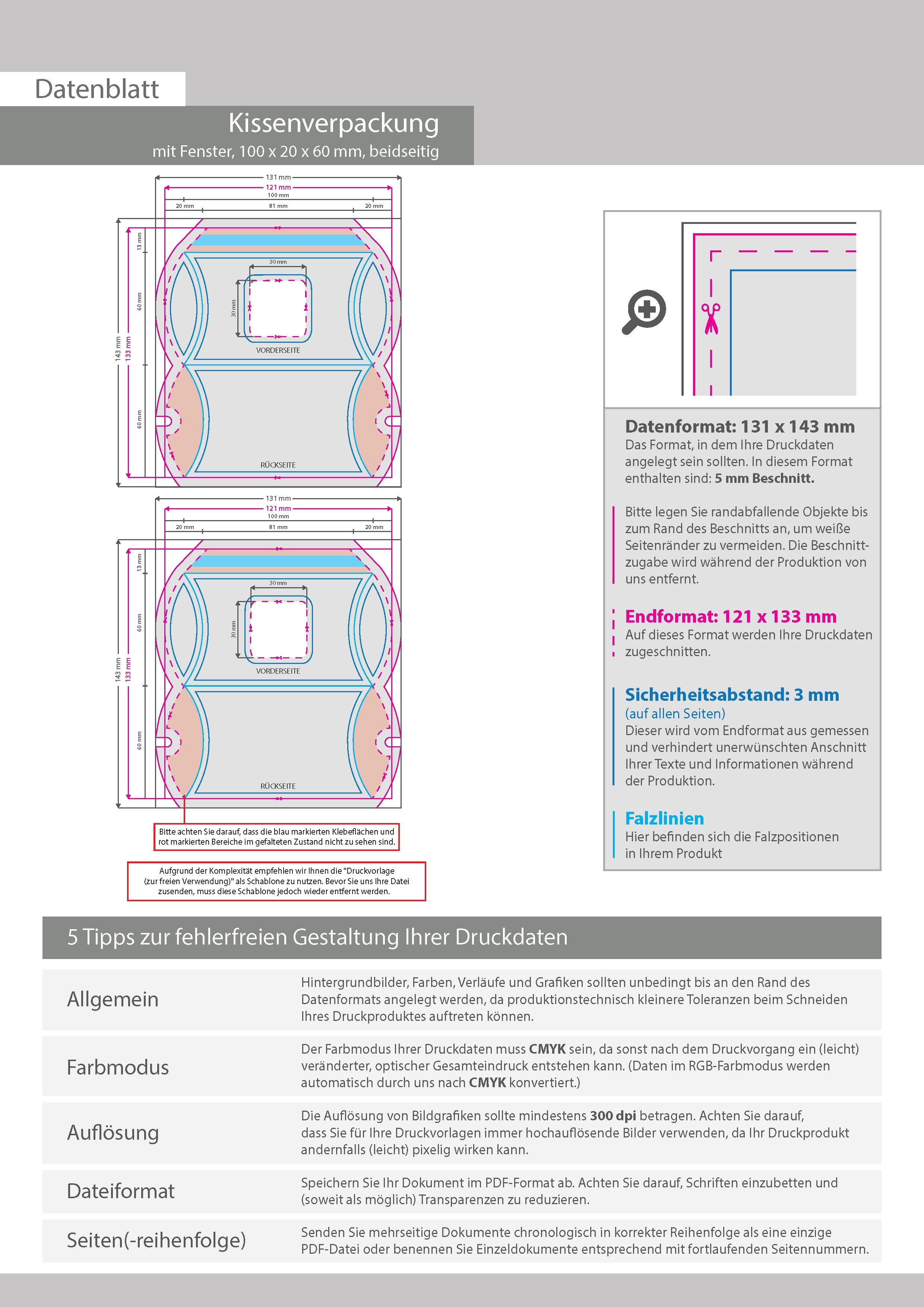 Kissenverpackung (10 cm x 2 cm x 6 cm) beidseitig bedruckt 5/4-farbig (CMYK + Sonderfarbe) mit geklebtem Fenster
